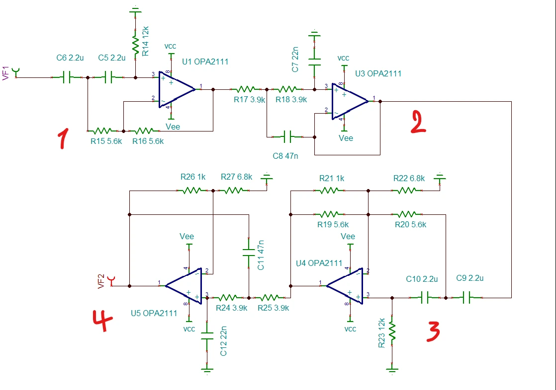 (یکی از سلولها کمی پایینتر، دیگری کمی بالاتر قرار داده شده تا Butterworth چهارم مرتبه بهدست بیاید.)