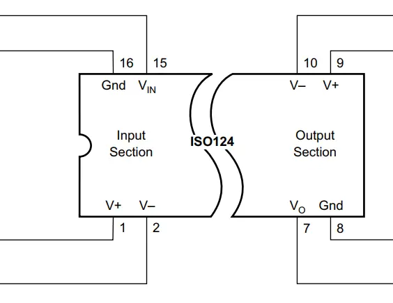 ISO124 یک تقویتکننده ایزوله آنالوگ با بهره واحد (Unity Gain) است که دارای ویژگیهای زیر میباشد: