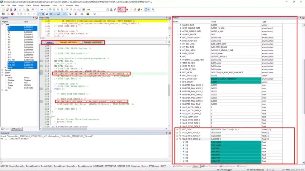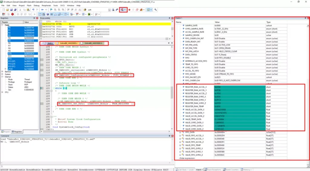 در نهایت وارد حالت Debug شده و با اضافه کردن IAM20680_Module به پنجره  watch و اجرای برنامه ، تغییرات مقادیر دما و ماژول GebraBit IAM20680 را در 3 محور  X , Y , Z هم به صورت مستقیم از رجیستر های داده و هم FIFO مشاهده می کنیم.