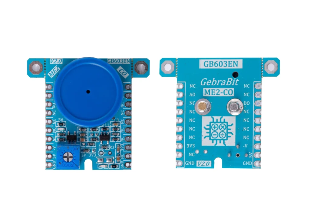 GebraBit ME-2CO یک ماژول الکتروشیمیایی تشخیص گاز CO میباشد. این ماژول دارای ولتاژهای کاری “3V3” و “5V” میباشد که توسط جامپر سلکتور تعبیه شده در قسمت پایینی ماژول قابل انتخاب است. ماژول GebraBit ME2-CO، خروجی سنسور ME2-CO را برای آنالیز بهتر دادهها توسط یک آپ امپ تقویت میکند. برای خواندن دیتای خروجی سنسور کافیست پین آنالوگ “AO” را به ADC میکروکنترلر متصل کنید. مقدار آستانه (threshold) شدت گاز توسط یک پتانسیومتر تعبیه شده در ماژول GebraBit ME2-CO قابل تنظیم است.