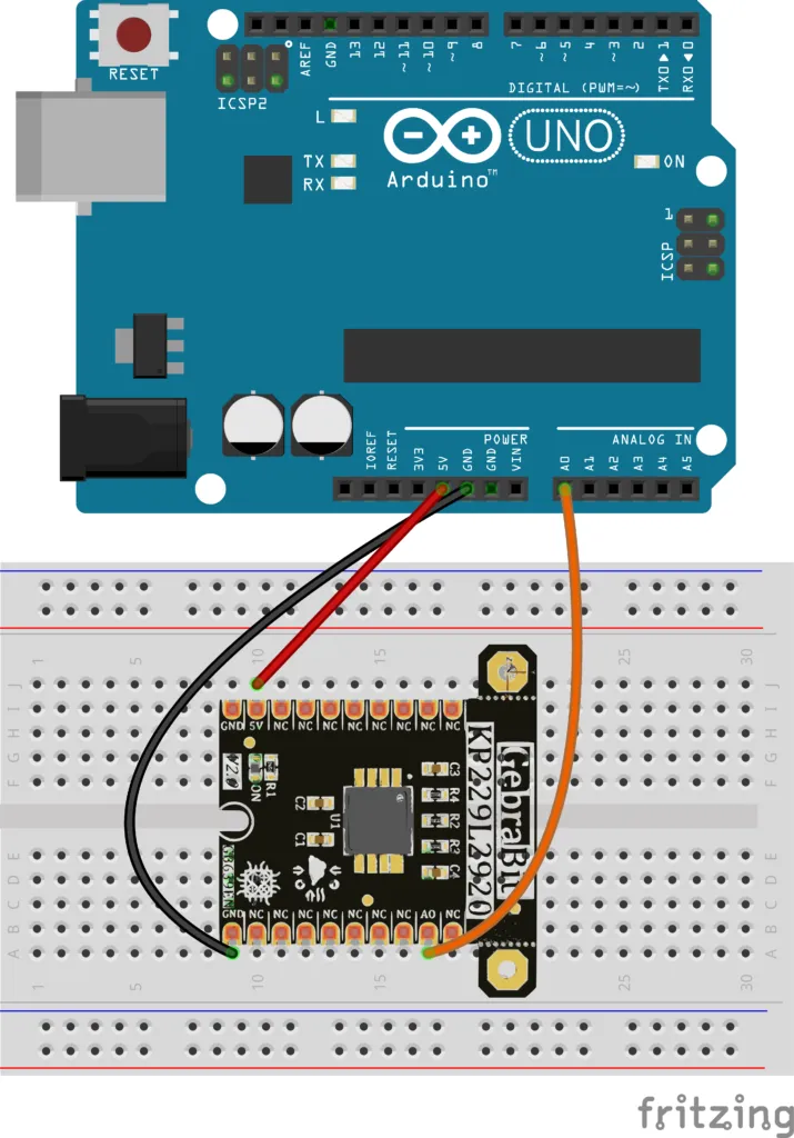 - پین “AO” ماژول KP229L2920را به یکی از پینهای آنالوگ برد ARDUINO UNO(مثلا پین A0) متصل کنید.(سیم نارنجی)