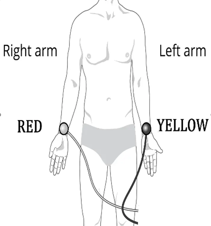 در کابلهای ECG سه لید، لیدها به سه رنگ قرمز ، سبز و زرد هستند که لید قرمز به دست راست، لید زرد به دست چپ شخص وصل میشود.