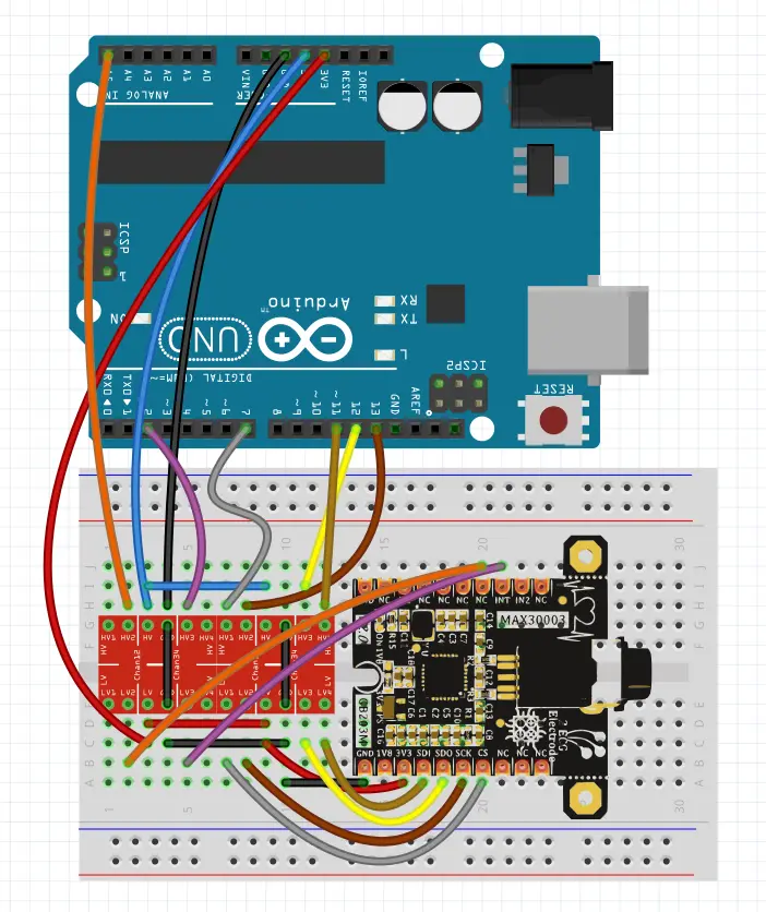 پس از اتصال آردوینو به ماژول توسط Logic Level Converter، کتابخانه MAX30003را دانلود و به نرم افزار آردوینو اضافه و برنامه پیوست را اجرا کنید.
